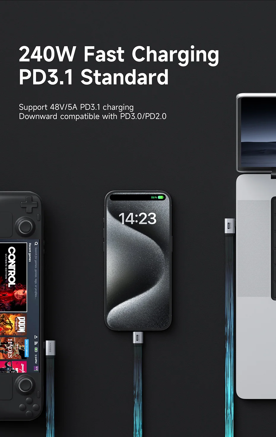 - 240W PD 3.1 (EPR) for high-power laptop charging